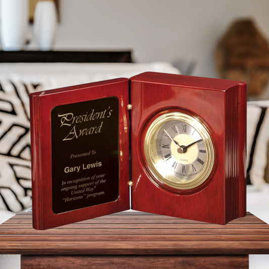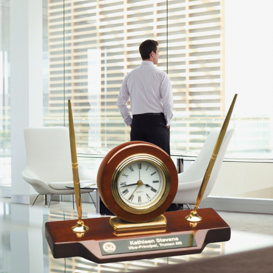 9" x 4 3/4" Piano Finish Desk Clock on Base with 2 Pens