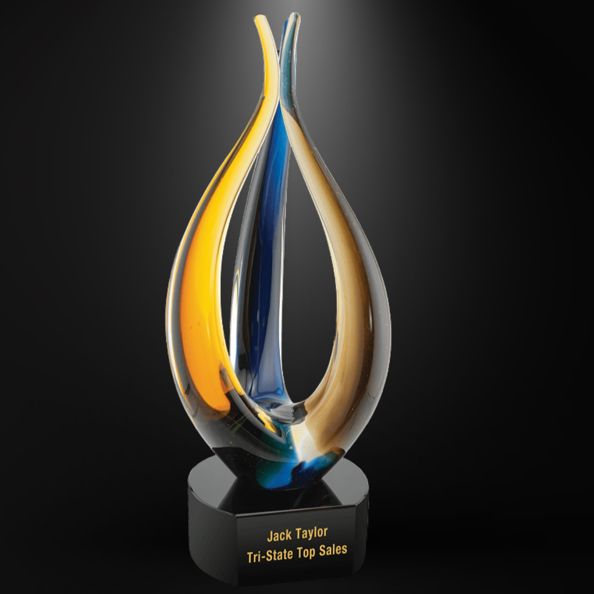 Artistically inspired hand blown glass sculpture. Each piece is uniquely different, colors and sizes will vary slightly. Premier Art Glass is mounted on a black glass base. Packaged individually in a lined gift