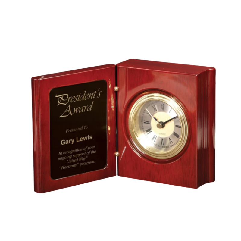 Make a timeless statement with our Rosewood Piano Finish Book Clock, measuring 4 5/8 inches (L) x 5 3/8 inches (H) x 2 1/4 inches (W). Featuring a high-polished surface and a stylish Quartz clock with a gold bezel, this elegant desk clock also includes second hand timing and an alarm function.