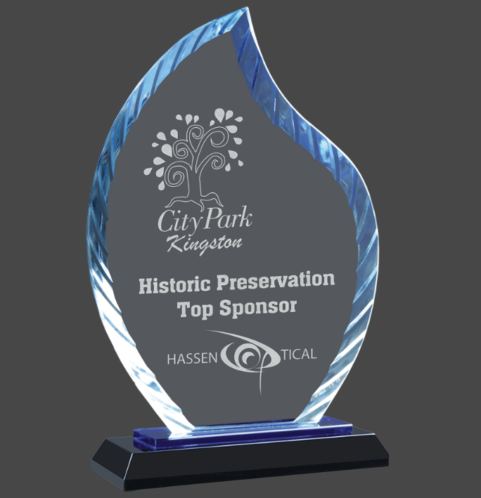Measuring 5 1/4 inches (L) x 8 inches (H), this stunning award features a beautiful Premier Blue Accent Glass mounted on a sleek blue and black base. Crafted from 3/8 inch thick glass, it stands as a perfect tribute to your accomplishments. Available in multiple sizes and 4 elegant styles—Diamond, Fan, Flame, and Oval—these awards can be personalized with your text, logo, or picture through sandcarving or laser engraving. Each piece comes elegantly boxed, ready to honor excellence in style!